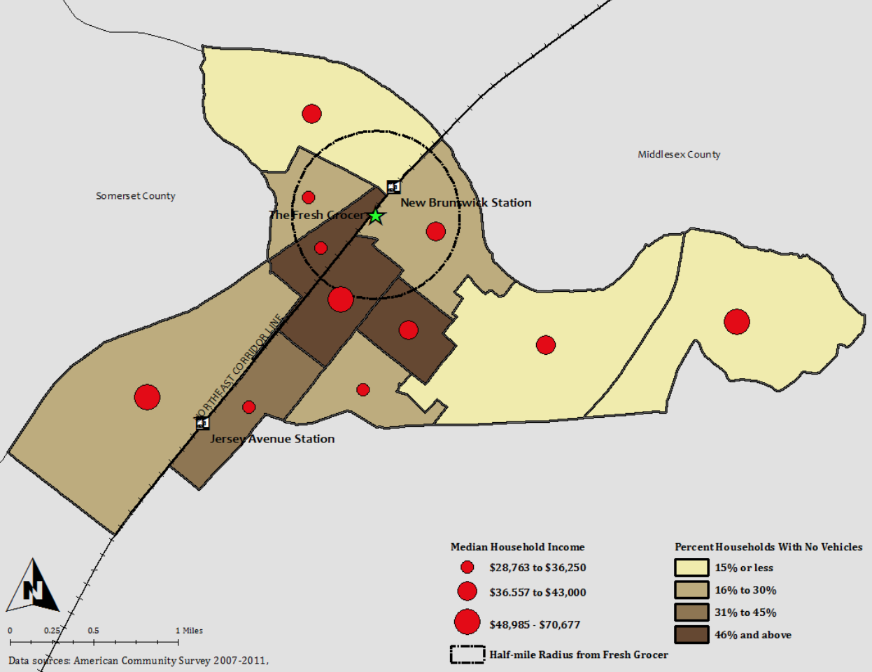 But even if the Fresh Grocer had been an ideal tenant and an ideal employer, I can’t imagine it would have had much success in providing healthy foods to underserved communities. This might seem improbable when we look at New Brunswick’s food desert map: Within a half-mile radius of the Fresh Grocer, three tracts have very low household vehicle use, and two have median household incomes under $37,000.