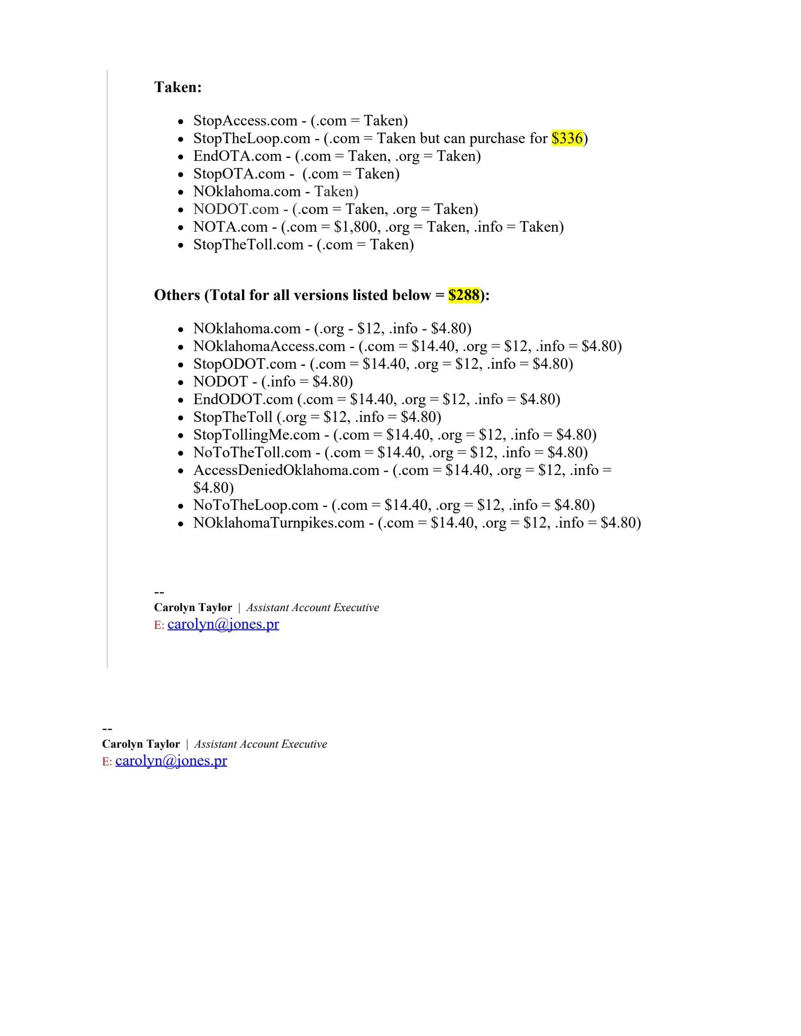 That evidence included an email exchange between an ODOT email address and Jones PR, a public relations contractor for the agency, dated as early as February 7, weeks before the announcement. In the exchange, a representative from ODOT requested that Jones PR purchase domains expressing opposition to ACCESS Oklahoma for a total of $412.80, including variations on their extensions: “.com,” “.info,” “.org,” and so on.
