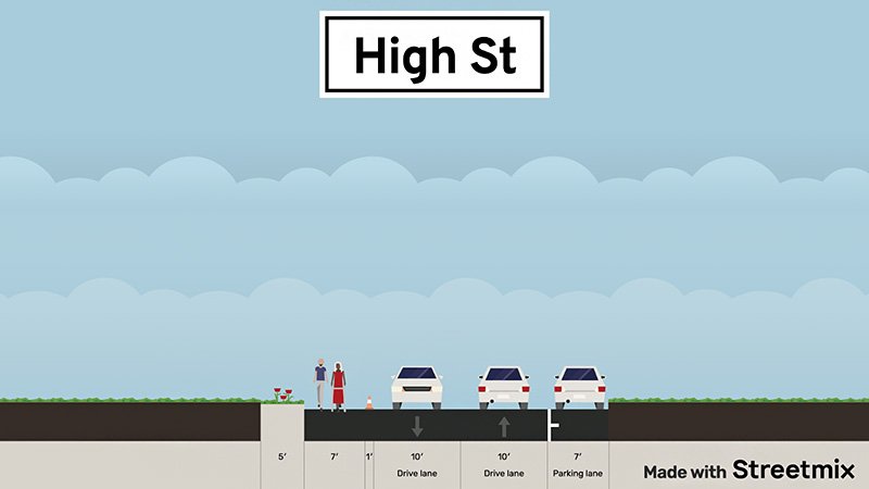 I'd narrow each travel lane to 10 feet wide for a total of 20 feet of roadway. The extra asphalt could be yielded to people walking. This would result in 20 feet of asphalt dedicated to the movement of cars and buses and a minimum of 8 feet of asphalt dedicated to people walking.