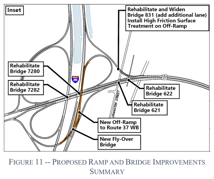 The full project spans roughly five miles between the bridges over Route 2 and those near Plainfield Pike in Cranston. It includes rebuilding two bridges, widening the corridor to add a third travel lane in each direction, and reworking entrance and exit ramps.