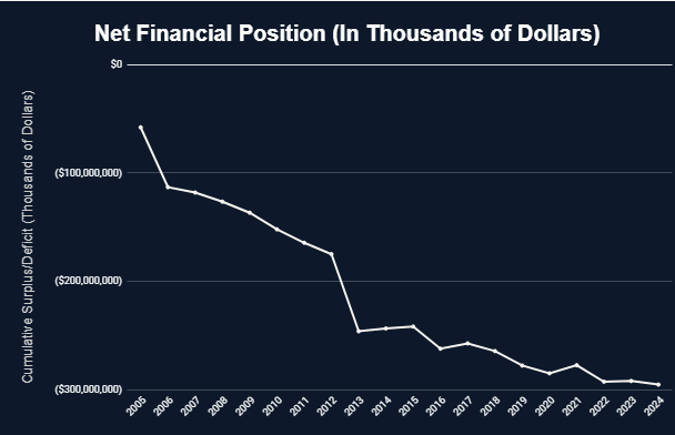 There is a way to measure this cumulative effect. It’s called Net Financial Position, the running total of past budget decisions (the surpluses or, in New York’s case, the deficits) that have been pushed into the future. At the end of 2024, the Strong Towns Financial Decoder shows that NYC’s Net Financial Position was nearly a negative $300 billion. The trend is not difficult to interpret.
