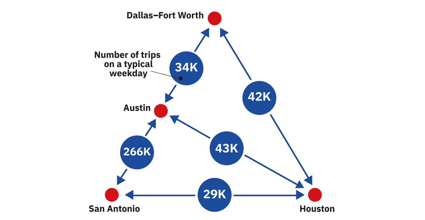The big opportunities for the state are in intercity transit between the various nodes of the Texas Triangle, where TxDOT projects total Vehicle Miles Traveled (VMT) will increase by more than 50% by 2050. Today, drivers make more than 40,000 daily trips between Houston and Dallas-Fort Worth, a 3.5-hour drive, and Houston and Austin, a 2.5-hour drive. Strikingly, Austinites and San Antonians make more than 266,000 daily trips along the 90-minute Interstate 35 corridor connecting the two cities. This corridor represents one of the highest-leverage opportunities for improving regional connectivity, and both TxDOT and Travis County are studying the feasibility of a rail connection between the two cities.