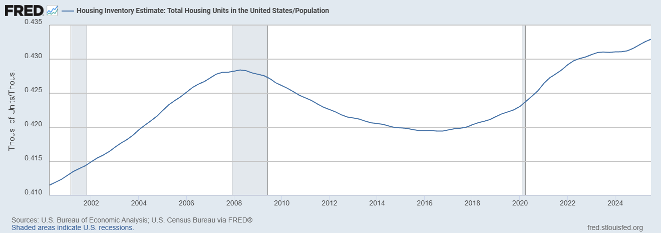 Then there’s the data that rarely makes it into these debates. According to the Federal Reserve’s own figures, housing units per capita in the United States have been rising steadily since the mid-2010s and now exceed pre-Great Recession levels. That doesn’t mean every community has enough housing. Housing markets are local, segmented, and deeply shaped by place. But it does complicate the claim that we are facing a uniform, national shortage that can be solved with a single, national prescription.
