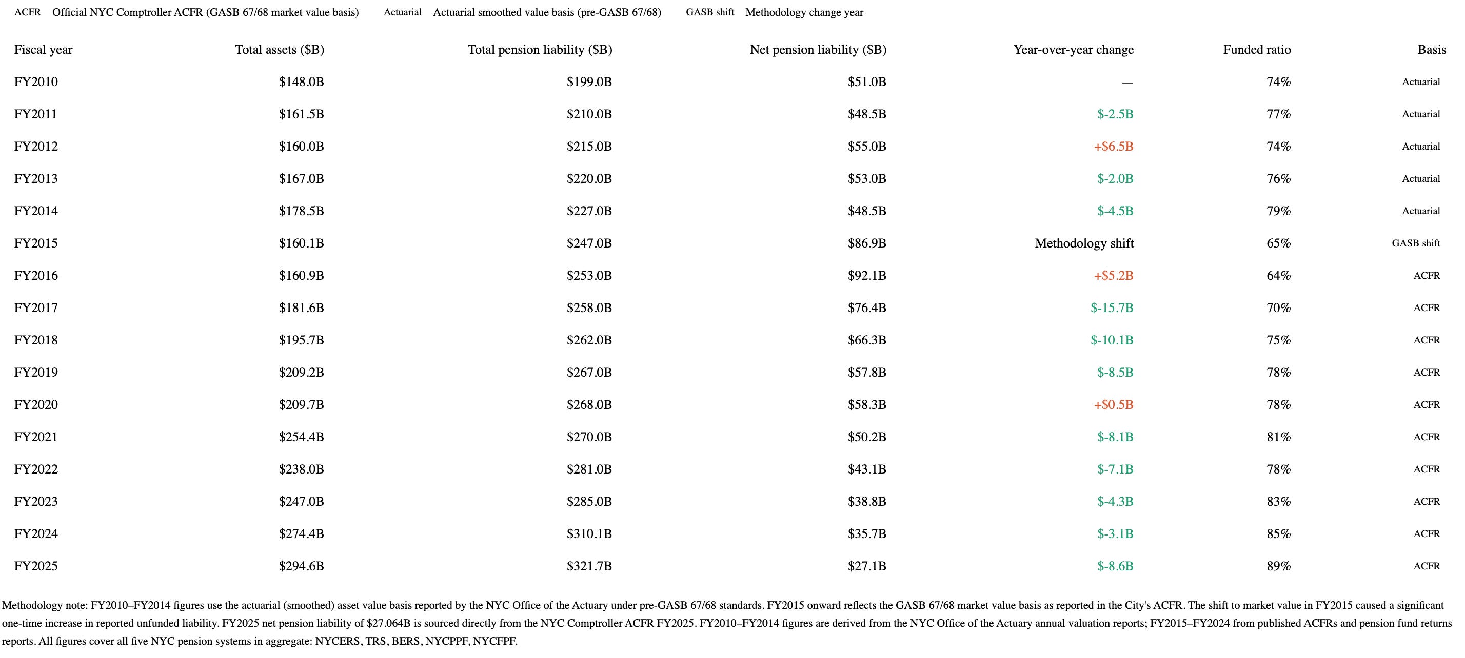 New York’s main pensions held $294.6 billion in assets at the end of Fiscal Year 2025. The city estimates that it’s Total Pension Liability (the present value of promised future retirement benefits for employees) is $321.7 billion. This means they’re only 89% funded, with around $27.1 billion in unfunded liabilities. Surprisingly, this is not terrible by national standards, and has, in fact, been gradually decreasing over the last decade plus.