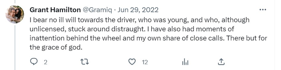 “I don't think it's necessarily [the driver's] fault,” said Hamilton. “For whatever reason, he didn't see me there. And he thought he was safe turning. We both felt safe entering that intersection and in the end, it wasn't safe. So there's some underlying thing there that is not my fault and not his fault. I think that maybe there is a deeper cause to this.”