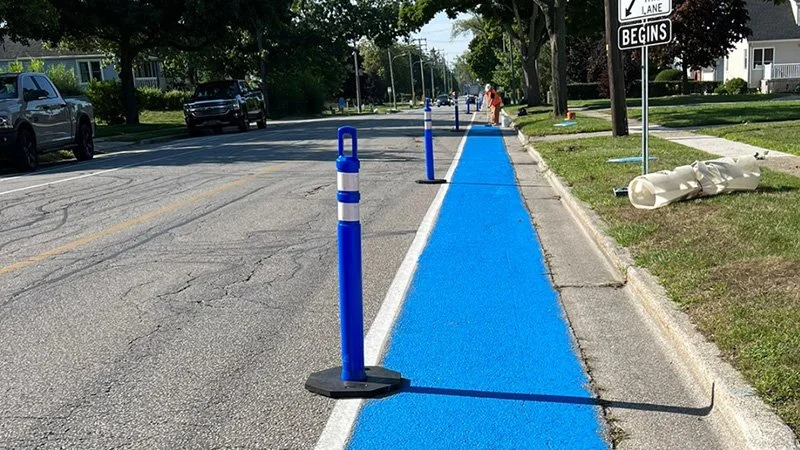 The setup remained in place for one week before the city disassembled the delineators. That was long enough for nuSarnia to conduct studies showing that the project reduced speeding and increased the number of bicycle users. As a result, the city decided to leave the bike lanes blue.