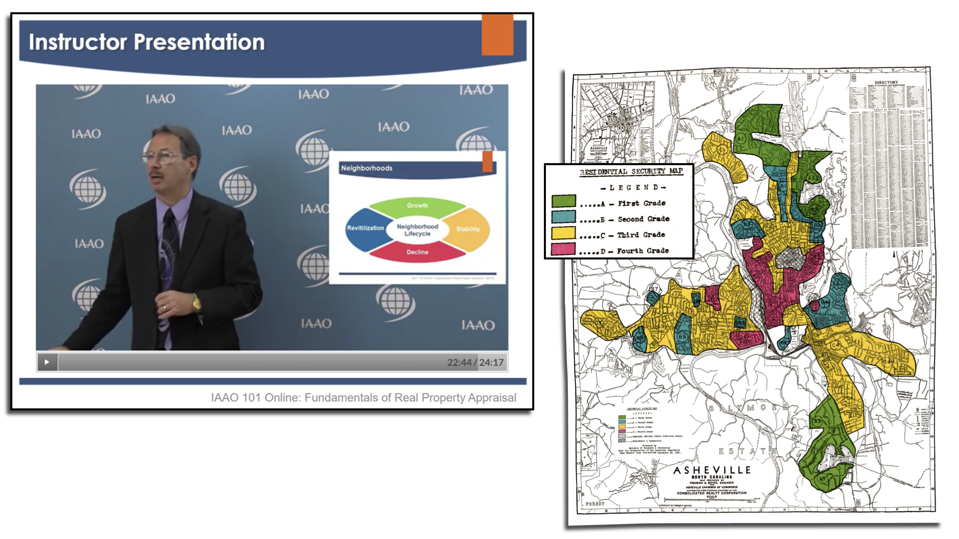 This is a slide from an IAAO course teaching the fundamentals of real property appraisal to both appraisers and assessors. It breaks down homes and neighborhoods into four color categories to represent what is called the “Neighborhood Lifecycle.” They are green, representing growth; blue, representing revitalization; yellow, representing stability; and red, representing decline—quite closely mimicking the practiced colors and categories of redlining maps.