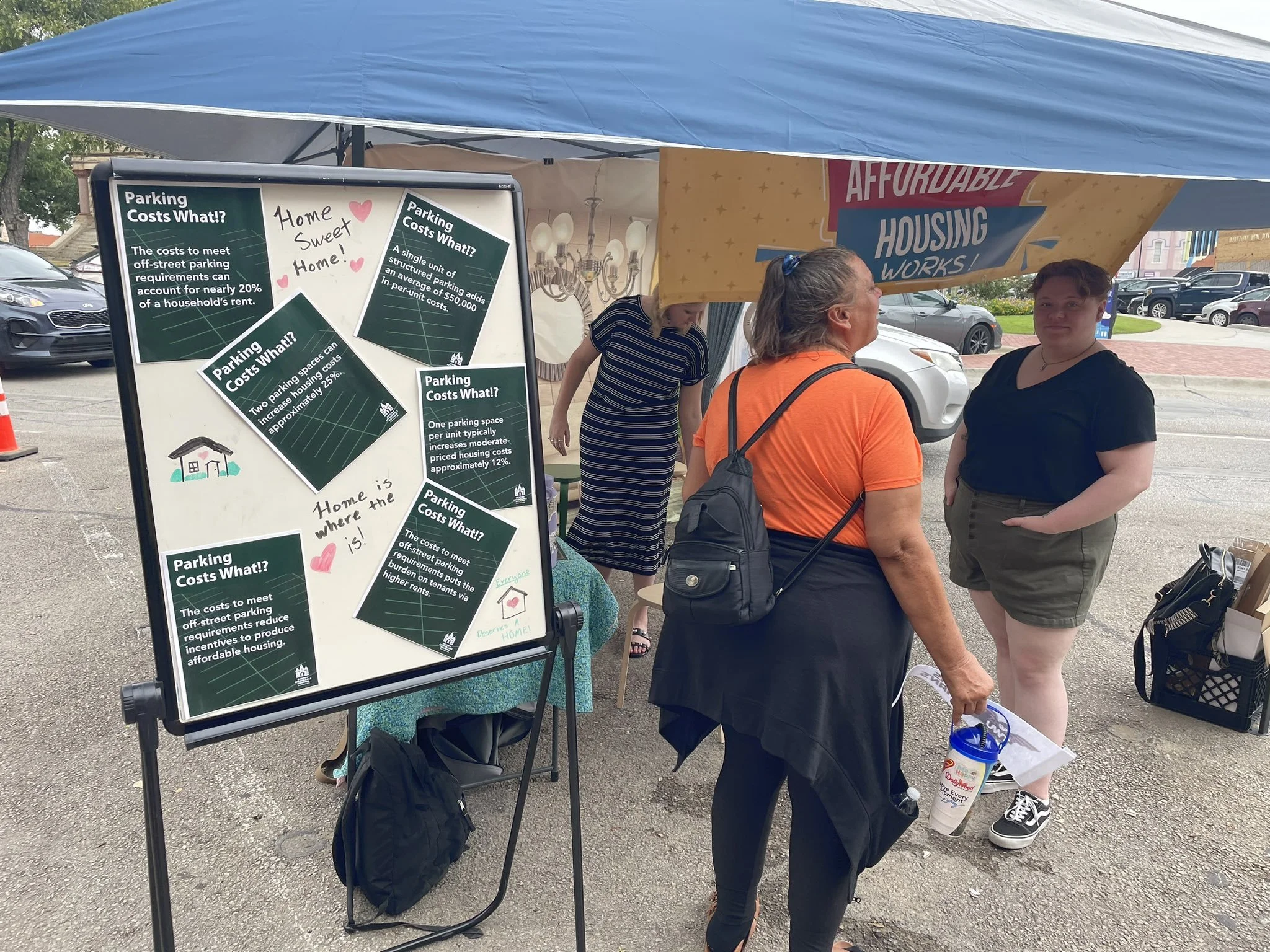 For example, parking minimum laws create higher costs for housing, as it creates another expensive hurdle to develop affordable homes. It also makes rent higher for residents who don’t have a car, as shared by one affordable housing group at the Parking Day event. On a board with many facts on how parking affects housing affordability, one paper said the costs to meet off-street parking requirements can account for nearly 20% of a person's rent.