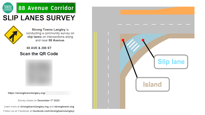 Slip lanes exist to keep cars moving fast at all times. They create a hazardous environment for both drivers and people using active transportation, especially if the slip lane is in a neighborhood area. For Langley, Hansen points out that a lot of local neighborhoods are easy to walk through, but it’s dangerous for people to cross the street when there is a slip lane. To help explain this to community members, Strong Towns Langley created a video and conducted a survey asking residents how they felt about this car-prioritized design: