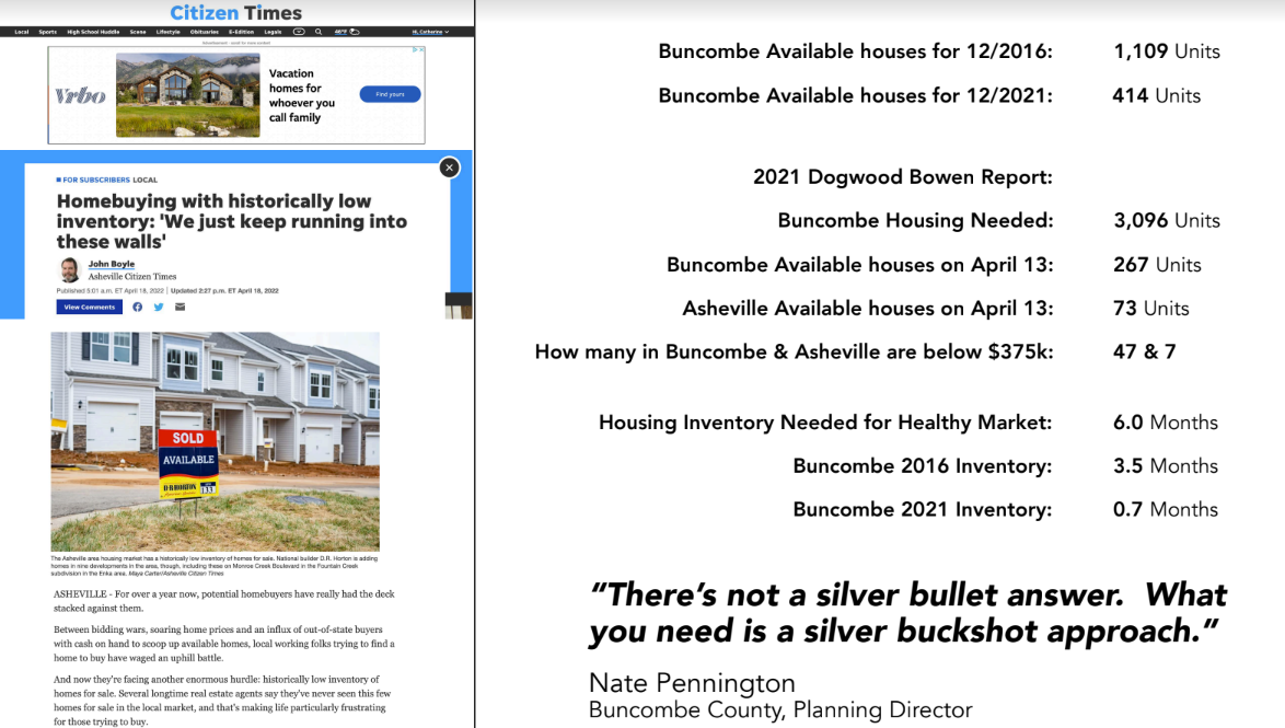 Minicozzi referenced Buncombe County Planning director Nate Pennington on the issue of housing shortages in North Carolina: “There is no silver bullet answer. What you need is a silver buckshot approach.”