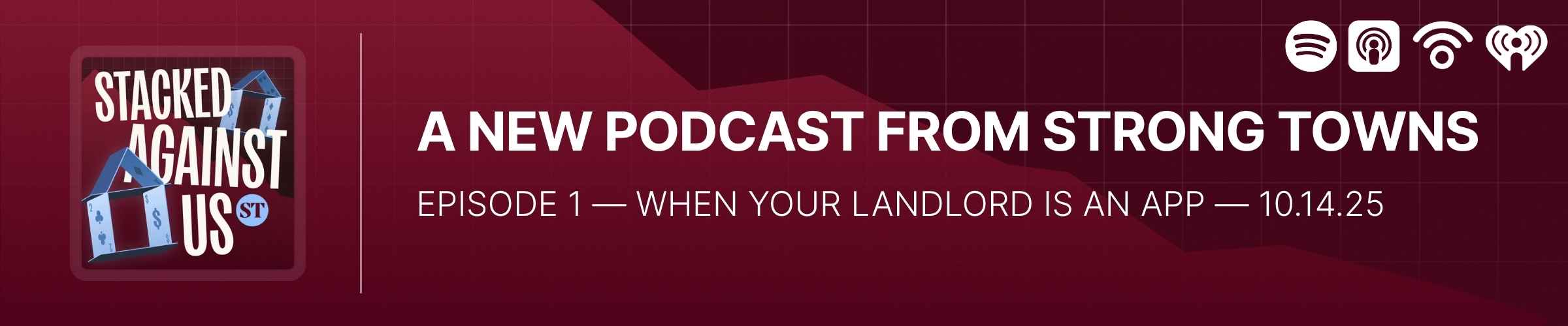 The first episode is officially live. Listen wherever you get podcasts, or visit strongtowns.org/stacked-against-us to access show notes, curated resources, and Strong Towns’ toolkits that dive deeper into the episode topics.