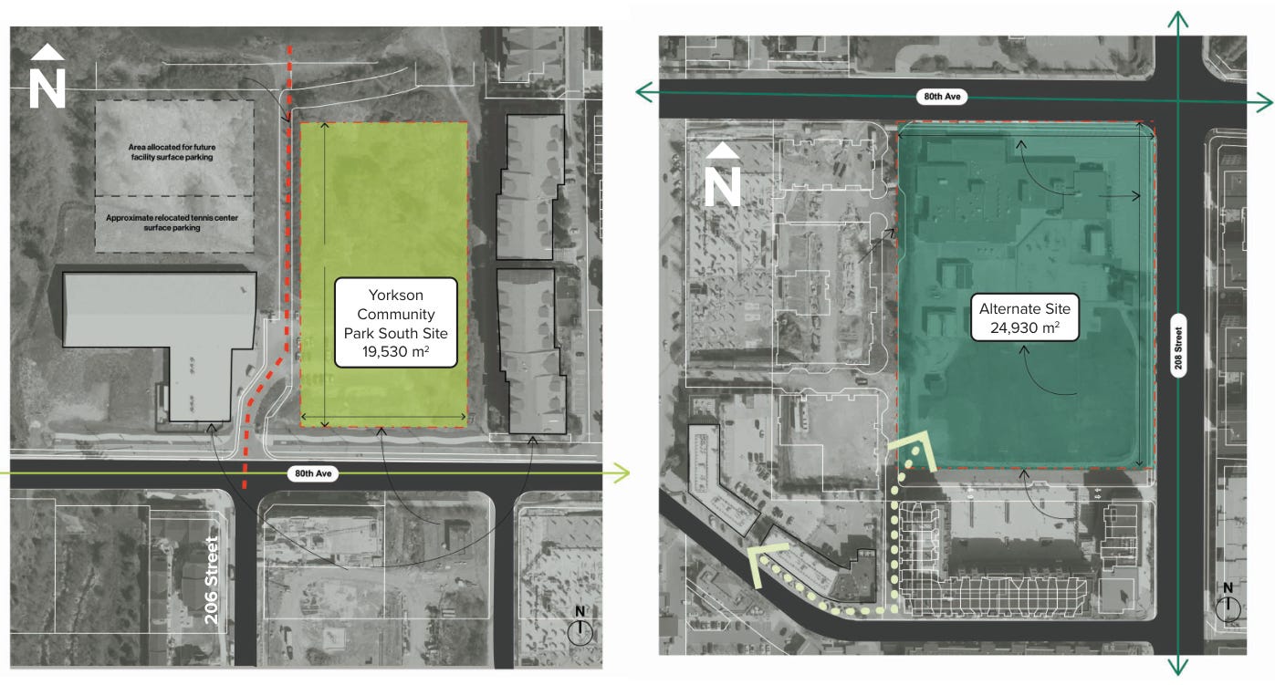 The Yorkson Park South site was certainly a simpler option: it’s vacant, readily available, and would have been faster and cheaper to build on. But its narrow 19,530-square-meter footprint was limiting. The 208 Street and 80 Avenue site, while requiring this complex land swap we’re now seeing, gives the Township 24,930 square meters to work with, much better integration with the surrounding urban area, improved building orientation, and the chance to create a real community hub.