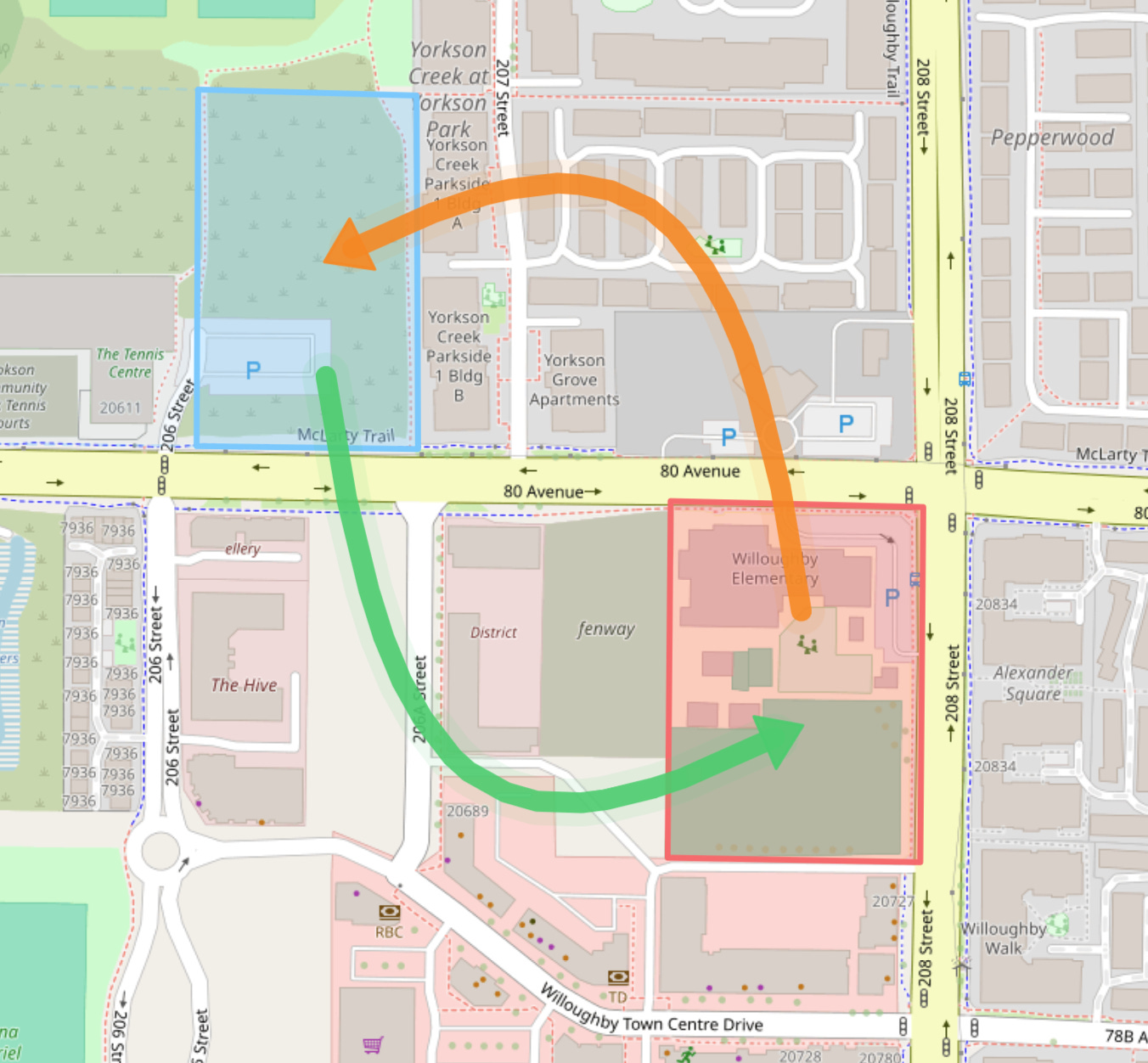 This outcome was also in part caused by planning neighborhoods to have a grid of hostile and busy arterial roads. In the original neighborhood plan, this might not have been foreseen as severe of an issue, as for the front of the school/town center area, the plan proposes 208 Street be scaled down to a street, with raised crosswalks and wide sidewalks.