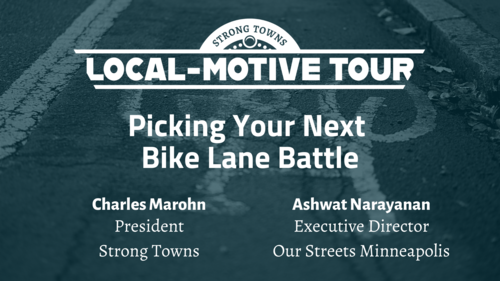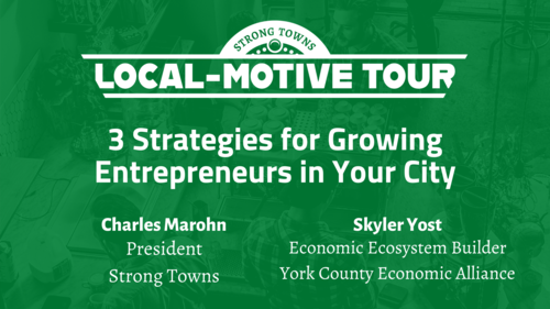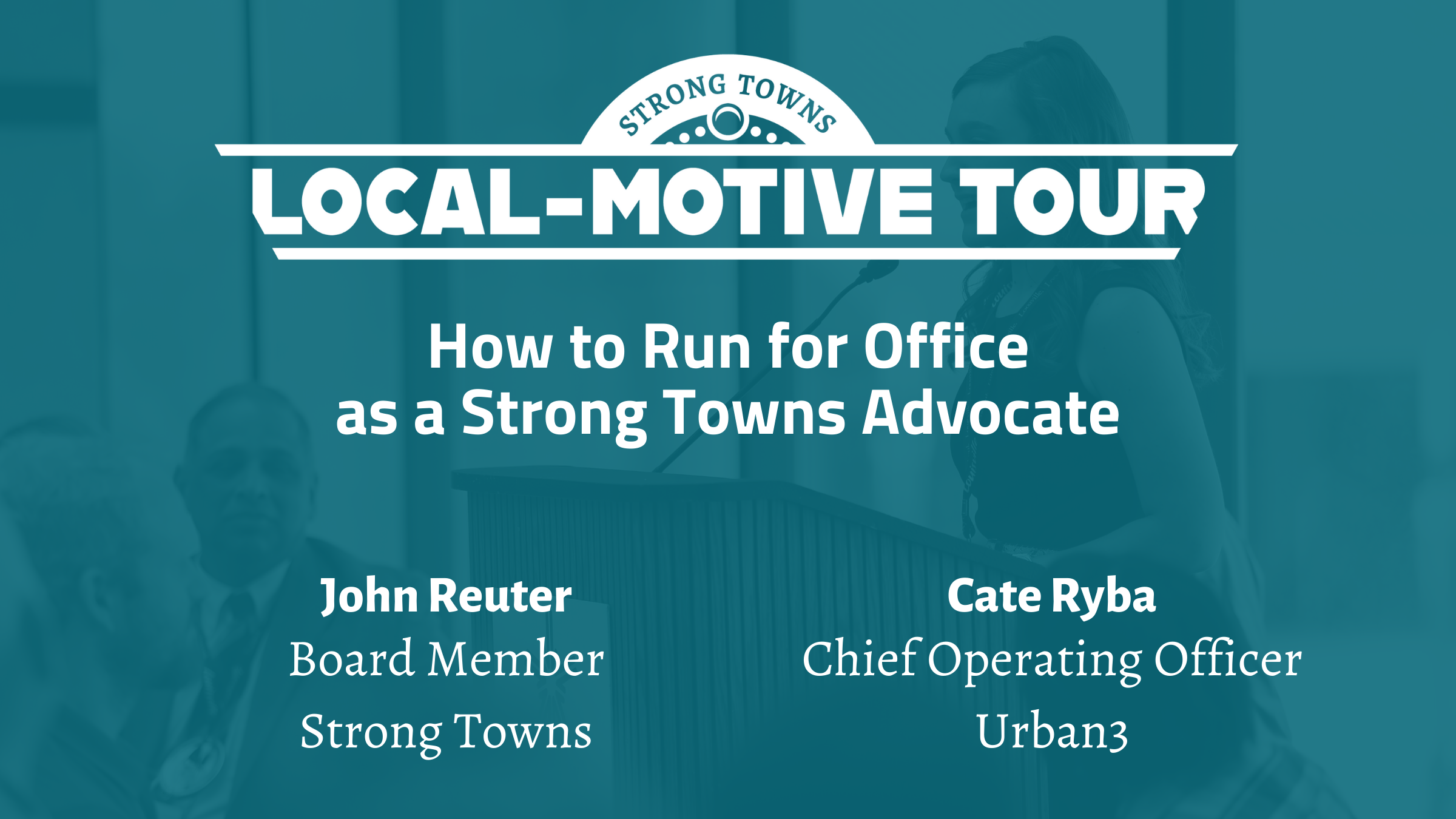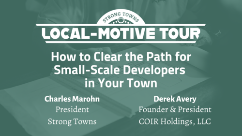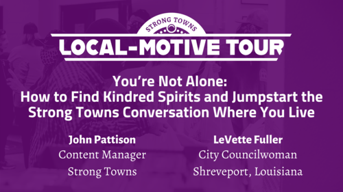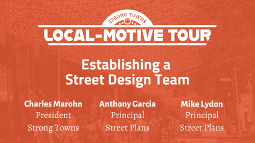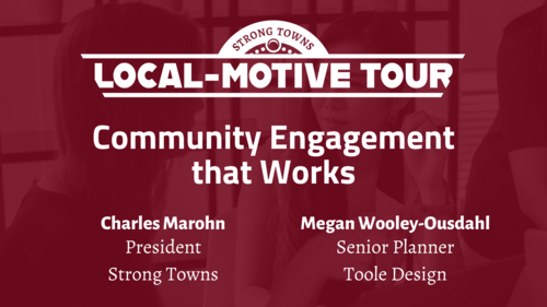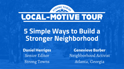 Take a ride on the Strong Towns Local-Motive Tour. These 20 exciting online sessions will give you the tools you need to take action and make your community more economically resilient. From fixing dangerous streets, to identifying obstacles to small-scale development, to running for office as a Strong Towns advocate—each of the tour stops provides participants with the tools and inspiration they need to get started building strong towns right now!