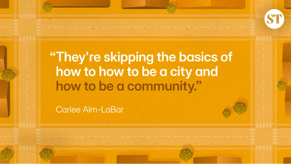 Even in places meant to be walkable—like the still developing commercial town centre—there are no real barriers between kids and traffic. Drivers pull in and out of busy entrances without expecting children. Patios are hemmed in by parking stalls, and there’s nowhere small, safe, and interesting for kids to wander, explore and play.